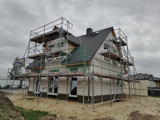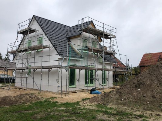Das Haus hat nun seine Putzschicht erhalten und die Gerüste stehen noch, da letzte Anpassungen und Feinarbeiten an der Fassade vorgenommen werden.