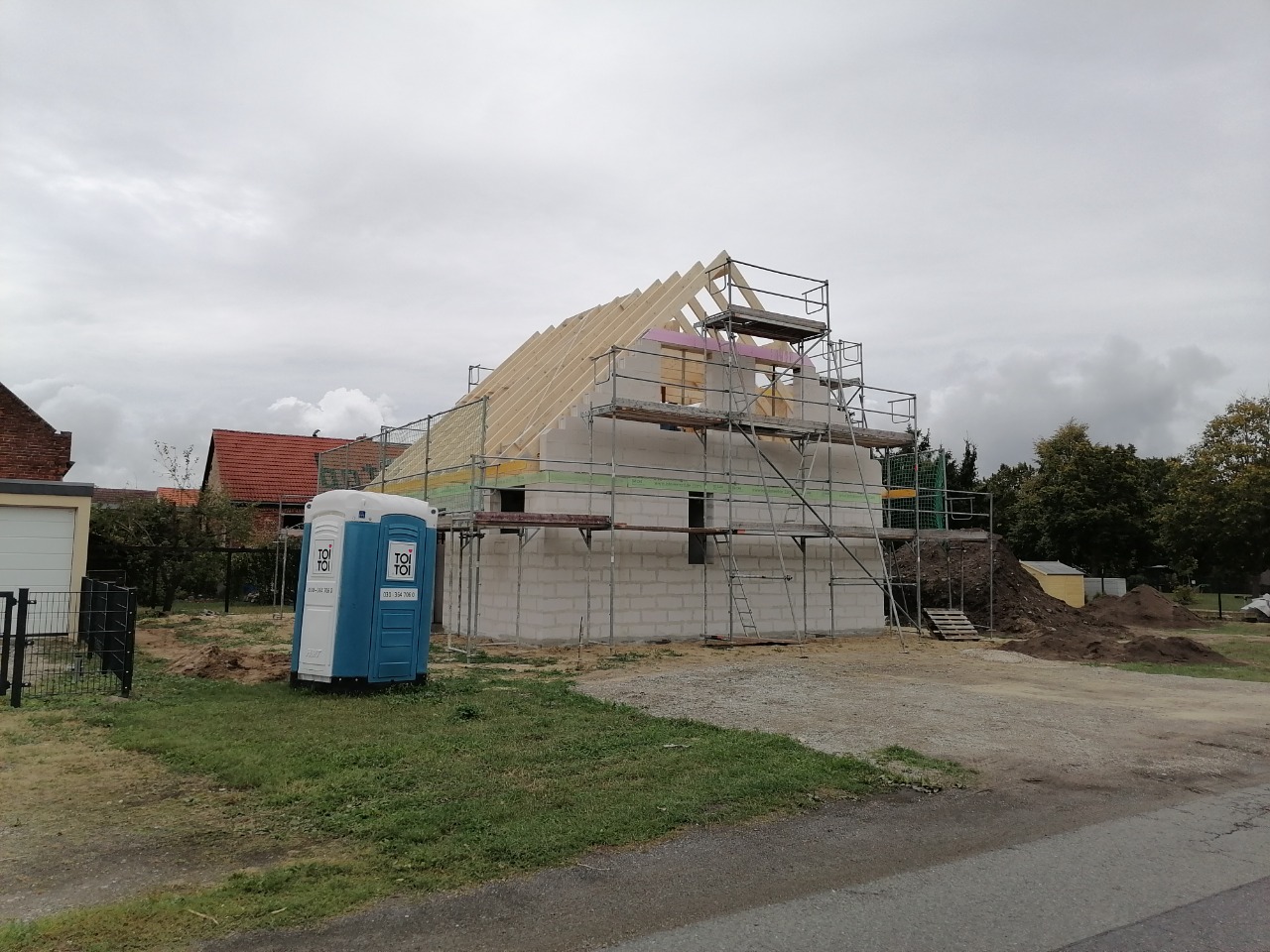 Ein weiterer bedeutender Fortschritt: Das Dach ist nun vollständig eingedeckt! Die Dachsteine sind verlegt, und das Haus ist endlich wetterfest. Auch die Dachgaube ist gut erkennbar und verleiht dem Gebäude zusätzlichen Charme. Mit der abgeschlossenen Dacheindeckung nähert sich der Rohbau seinem Abschluss. Nun kann die Arbeit an den Fassaden und im Inneren des Hauses weitergehen. Die Vorfreude auf das fertige Eigenheim wächst!