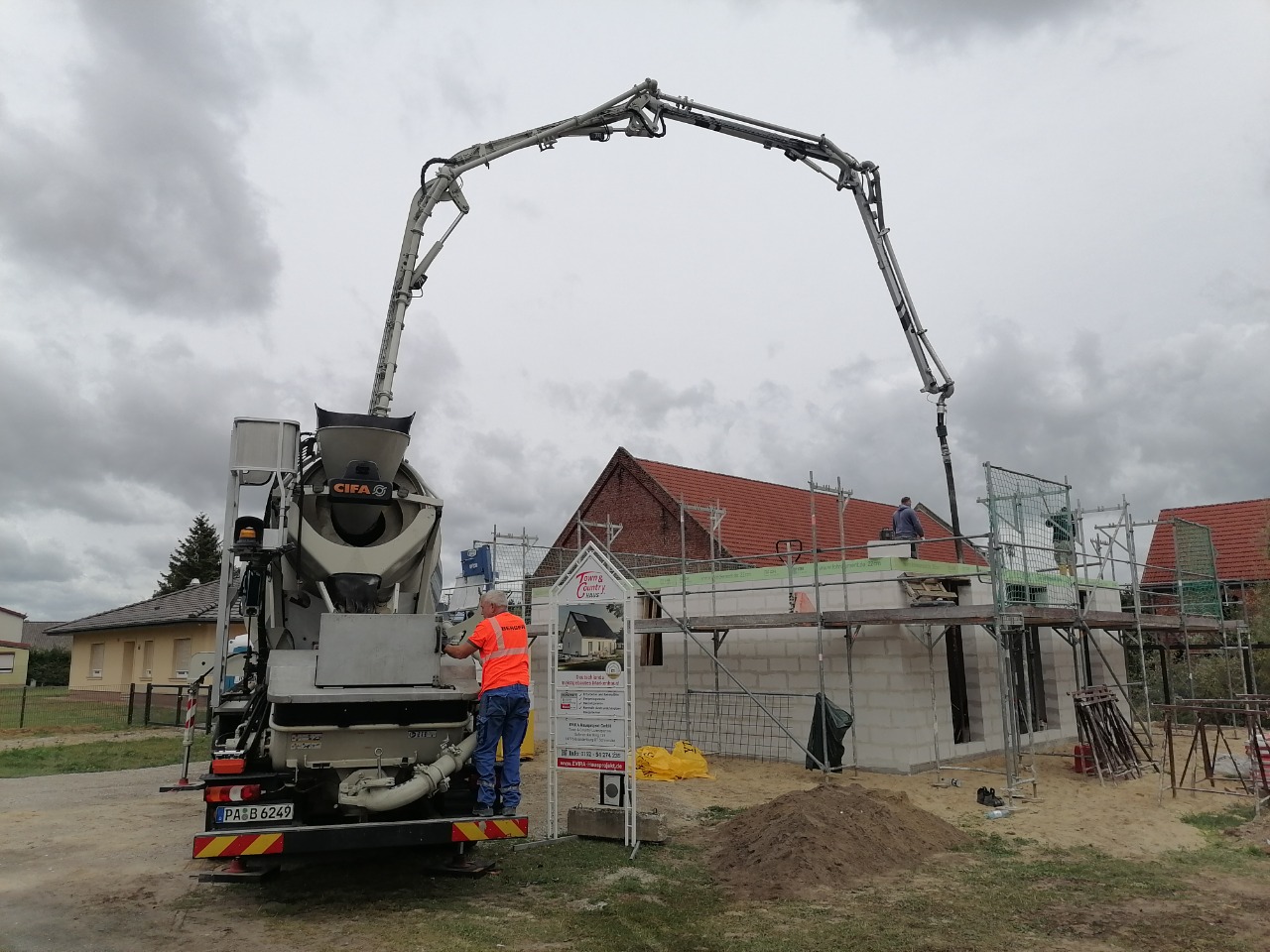 Heute ist ein weiterer Meilenstein erreicht: Die Decke des Hauses wird betoniert! Mit einer Betonpumpe wird der frisch angelieferte Beton gleichmäßig verteilt. Die Decke bildet die Grundlage für das nächste Stockwerk.